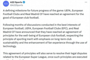 “足球运动未来发展的里程碑:欧足联、欧洲俱乐部协会与皇马已达成有利于欧洲俱乐部足球发展的协议。