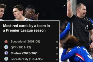 切尔西(2025-26赛季)、莱斯特城(1994-95赛季)、布莱克本(1998-98赛季)、西汉姆(1999-2000赛季)、纽卡(2008-09赛季)、桑德兰(2013-14赛季):8红