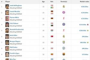进攻型中场德转身价排名: