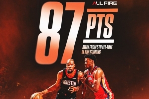 体育资讯3月16日讯 近日火箭官方晒出动态显示,杜兰特生涯总得分还差87分就将超越历史第五的乔丹。