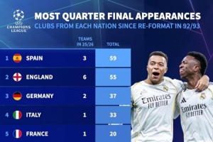 24直播网03月17日讯 根据德国转会市场统计,自1992-93赛季欧冠改制以来,西班牙和英格兰球队晋级八强的次数遥遥领先,分别以59次和55次位居前两位。德国以37次位列第三,意大利33次紧随其后。该数据凸显了西甲与英超在欧洲足坛的强大竞争力。