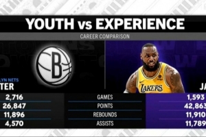 湖人客场挑战篮网,转播方晒出篮网全队和詹姆斯的数据对比,篮网全队的得分、篮板和助攻之和都没有詹姆斯的个人数据多。
