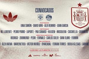 体育资讯03月20日讯 西班牙国家队今日公布了新一期球员名单,本次国际比赛日,西班牙将先后交手塞尔维亚、埃及。