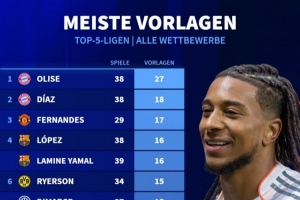 本赛季五大联赛球员助攻榜:奥利塞以27次助攻断层领跑,迪亚斯以18次助攻位居次席。
