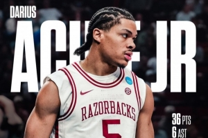 24直播网03月22日讯 NCAA疯三32强赛中,阿肯色大学94-88险胜海波特大学,晋级甜蜜16强。双方后卫对飚成焦点,阿肯色新人后卫小达里厄斯·阿卡夫狂砍36分6助攻,末节连得9分锁定胜局;海波特后卫罗伯·马丁空砍30分5助攻。