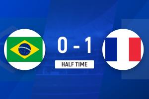 法国半场1-0领先巴西,姆巴佩单刀破门建功,登贝莱送出助攻,马丁内利错失良机险些扳平。