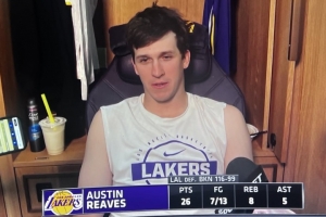 24直播网03月28日讯 湖人战胜篮网后,里夫斯展望假期,计划打高尔夫并陪伴家人。此役他高效砍下26分8篮板5助攻,正负值全场最高+26,是球队获胜的关键功臣。