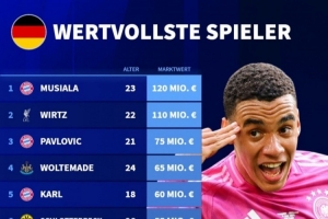 24直播网03月29日讯 德国转会市场公布最新球员身价榜。穆西亚拉以1.2亿欧居首,维尔茨1.1亿欧紧随其后。榜单同时列出德国U21球员身价,帕夫洛维奇以7500万欧领跑青年才俊,凸显德国足坛人才济济。