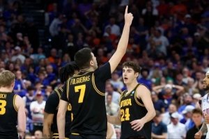 当完赛的蜂鸣器响起的瞬间,爱荷华大学的队员们互相拥抱庆祝,他们淘汰了卫冕冠军佛罗里达大学,自1999年以来首次晋级甜蜜十六强。