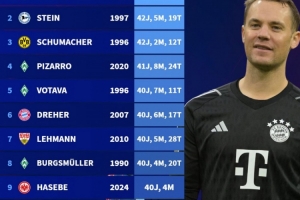 24直播网04月04日讯 拜仁门将诺伊尔在对阵弗赖堡的比赛中迎来德甲首秀,正式跻身德甲“40岁俱乐部”。根据官方数据,他以40岁8天的年龄,成为德甲历史上最年长的出场球员之一,位列历史出场年龄排行榜。