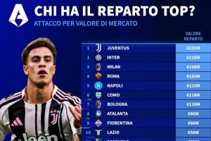 24直播网04月16日讯 根据德转统计,意甲前锋球员总身价排行:尤文以2.31亿欧居首,国米(2.15亿欧)次之,米兰(1.68亿欧)位列第三。罗马、那不勒斯等队紧随其后,展现了意甲锋线球员的整体市场价值分布。