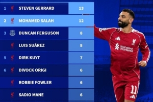 默西赛德郡德比历史射手榜:杰拉德13球,萨拉赫12球,苏亚雷斯8球。