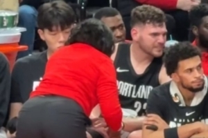克林根首节两手均受伤,队医处理时杨瀚森坐在旁边